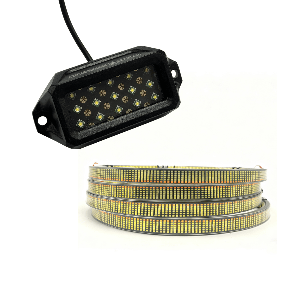 Our kits use true RGB+W technology with a separate white LED chip, are fully IP‑68 waterproof and are engineered to survive mud, water and extreme cold. They’re among the brightest on the market (around 4 000 lumens per pod), include detailed DIY instructions and password‑protected Bluetooth/remote control, and are backed by a strong warranty.